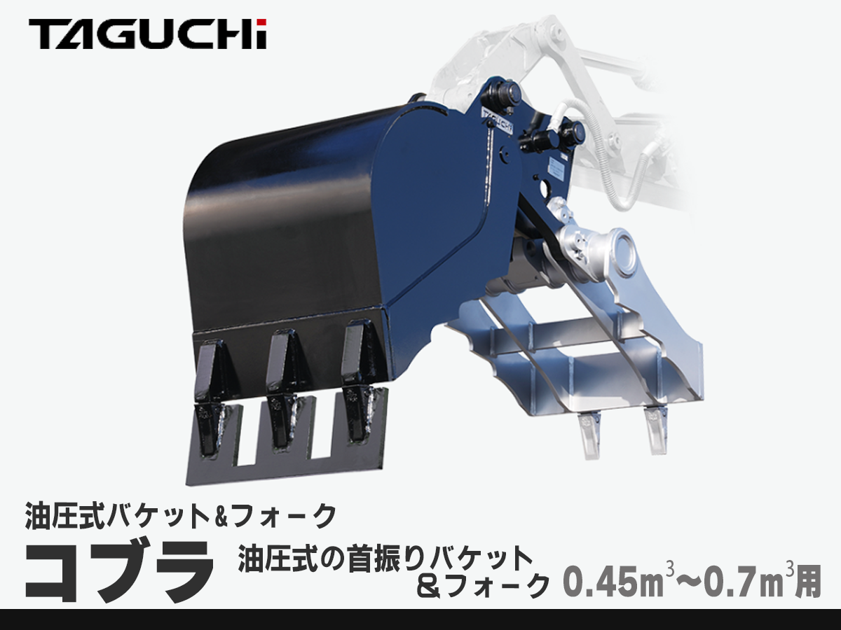 タグチ工業 |コブラ(油圧式の首振りバケット&フォーク) 数量限定イベント中! 油圧式の首振りバケット&フォーク -